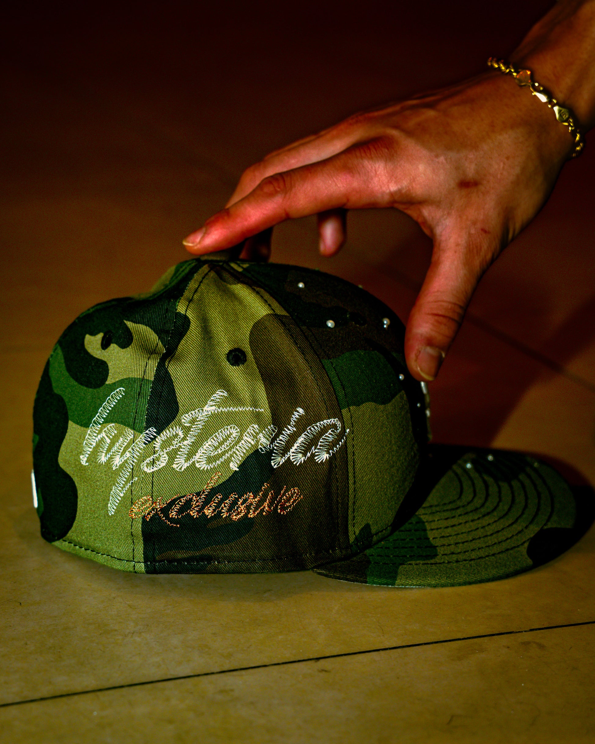 Pearlized Mets Camouflage Fitted with scattered pearl design and embroidery.